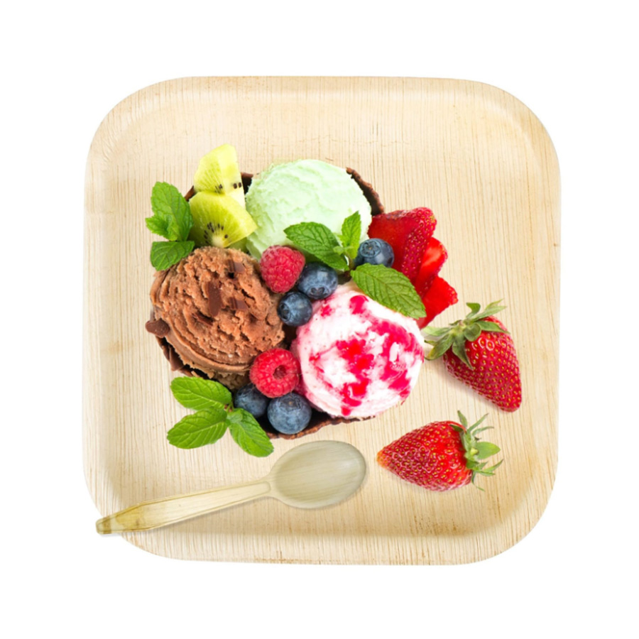 4 x 4 Inch Palm leaf square shallow plate is flat organic disposable shallow square plate of small version which is Super light and versatile and perfect for saucy appetizers, starters, snacks and desert foods and ready to cook products.